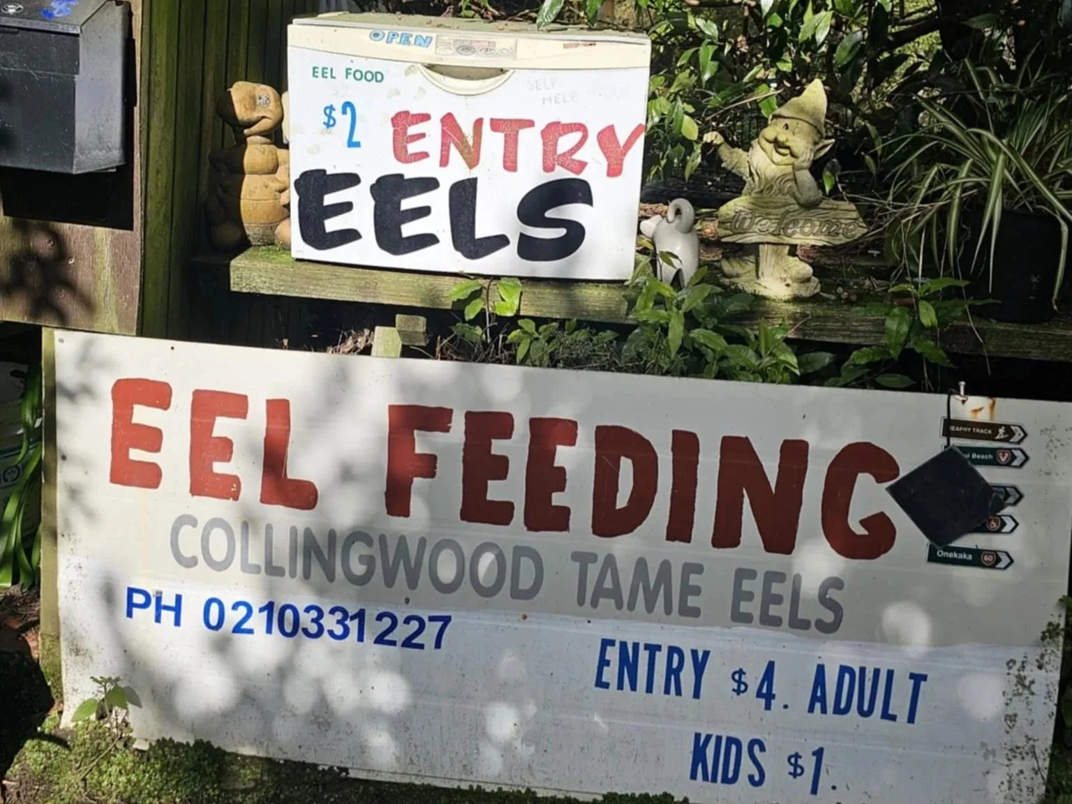 Head towards Collingwood, and instead of turning right into the township, take a left at the bottom of the hill just past Zatori. Once you’ve made the turn, you’ll find the eel-feeding spot about 50 metres up the drive on the left-hand side.